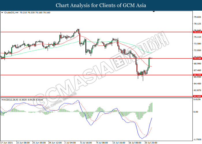 CrudeOIL, H4: Harga minyak mentah telah didagang dengan lebih tinggi sementara kini menguji di tahap rintangan 70.15. MACD yang memaparkan mometnum bullish mencadangkan komoditi ini untuk melanjutkan keuntungannya selepas ia memecah tahap rintangan tersebut.