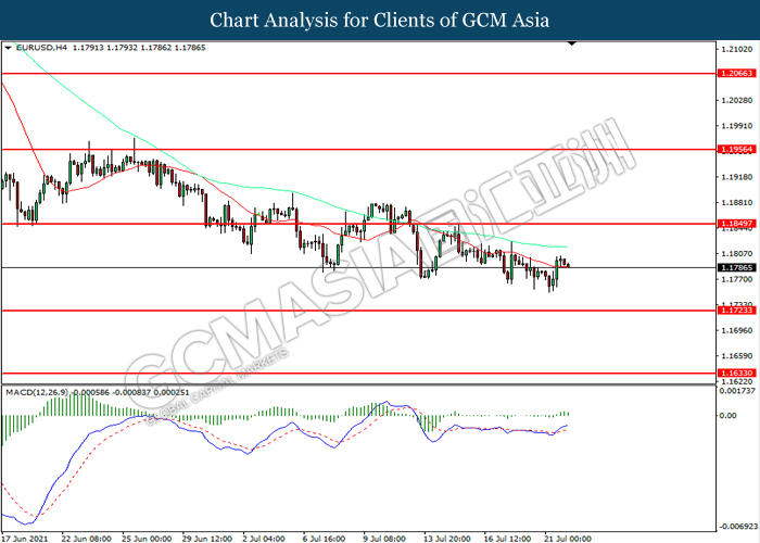 EURUSD, H4: EURUSD telah didagang dengan lebih rendah selepas ia memecah tahap sokongan terdahulu 1.1850. MACD yang memaparkan momentum bullish yang berkurangan mencadangkan pasangan ini untuk melanjutkan kerugiannya ke arah tahap sokongan 1.1725.