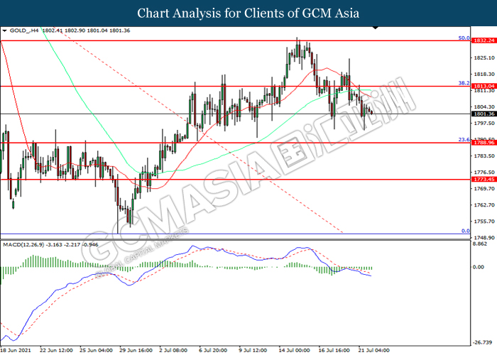 GOLD_, H4: Harga emas telah didagang dengan lebih rendah selepas ia memecah tahap sokongan terdahulu 1813.05. MACD yang memaparkan momentum bearish mencadangkan komoditi ini untuk melanjutkan kerugiannya ke arah tahap sokongan 1788.95.
