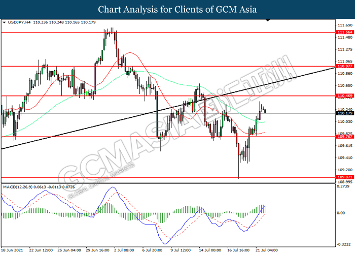 USDJPY, H4: USDJPY telah didagang dengan lebih tinggi selepas ia memecah tahap rintangan terdahulu 109.75. Namun, MACD yang memaparkan momentum bullish yang berkurangan mencadangkan pasangan ini untuk mengalami pembetulan teknikal bagi jangka pendek.