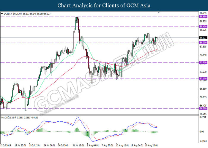 Dolar AS yang mengukur nilainya berbanding dengan enam pasangan mata wang utama telah mengekalkan kekukuhannya pada paras 98.00 berikutan dengan pembebasan Minit Mesyuarat FOMC. Minit tersebut telah menunjukkan bahawa kebanyakan ahli penggubal dasar merujuk pemotongan kadar terkini sebagai tindakan pelarasan pertengahan kitaran terhadap risiko kelembapan ekonomi serta kebimbangan perang perdagangan dan bukannya permulaan siri pemotongan kadar yang agresif. Namun di tengah-tengah kebimbangan terhadap kemelesetan ekonomi global yang makin meningkat, ahli-ahli FOMC telah bersetuju bahawa panduan dasar terkini dan program QE tidak mencukupi untuk membendung kemelesetan tersebut dan mengisyaratkan bahawa Fed masih bersikap terbuka terhadap pemotongan kadar yang selanjutnya. Di samping itu, Presiden AS Donald Trump telah mengkritik Pengerusi Fed Jerome Powell secara berterusan bahawa masalah yang dihadapi oleh AS kini bukannya mengenai perang perdagangan, namun adalah disebabkan oleh dasar kewangan Fed dan juga tindakan Powell yang tidak memotong kadar secara agresif. Para pelabur kini akan memberi tumpuan kepada Simposium Jackson Hole pada Jumaat ini di mana Jerome Powell dijangka untuk memberi isyarat yang lebih lanjut terhadap panduan dasar kewangan mereka. Indeks dolar telah menyusut sebanyak 0.04% ke 98.10 sementara pasangan USD/JPY menurun sebanyak 0.16% ke 106.43.