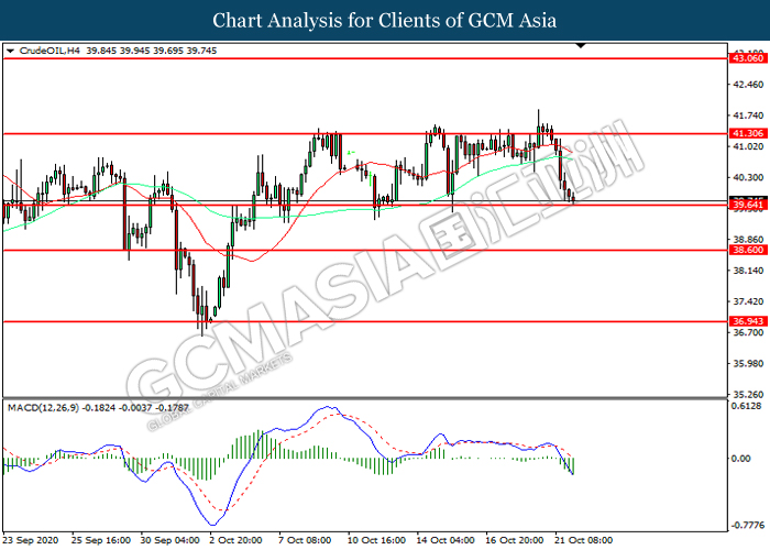 CrudeOIL, H4: Harga minyak mentah telah didagang dengan lebih rendah sementara kini menguji di tahap sokongan 39.65. MACD yang memaparkan momentum bearish mencadangkan komoditi ini untuk melanjutkan kerugiannya selepas ia memecah tahap sokongan tersebut.