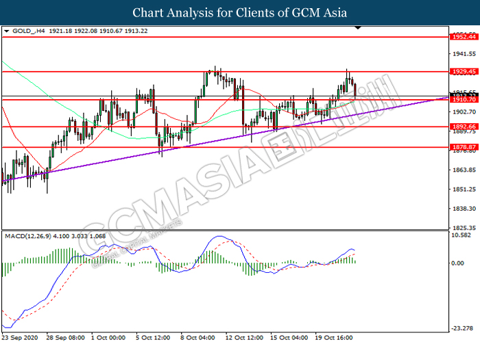 GOLD_, H4: Harga emas telah didagang dengan lebih rendah sementara kini menguji di tahap sokongan 1910.70. MACD yang memaparkan momentum bullish yang berkurangan mencadangkan komoditi ini untuk melanjutkan kerugiannya selepas ia memecah tahap sokongan tersebut.