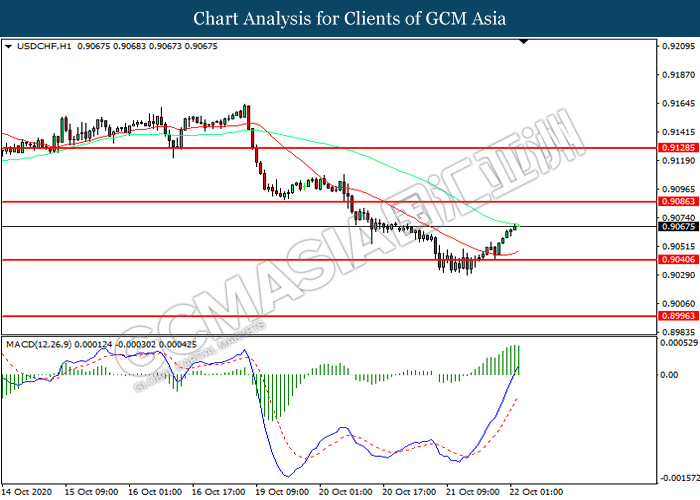 USDCHF, H1: USDCHF telah didagang dengan lebih tinggi selepas ia melantun dari tahap sokongan 0.9040. MACD yang memaparkan momentum bullish mencadangkan pasangan ini untuk melanjutkan keuntungannya ke arah tahap rintangan 0.9085.