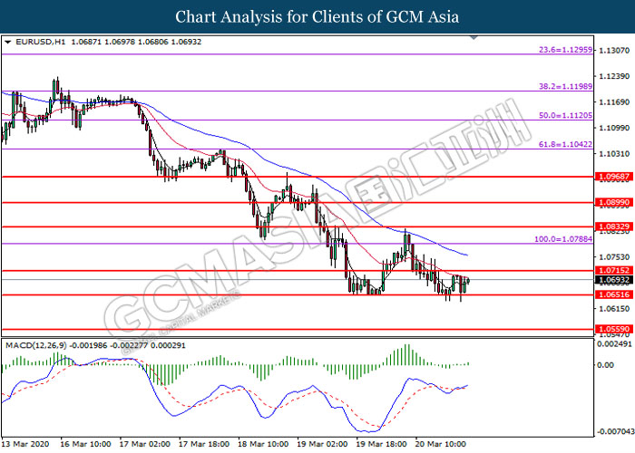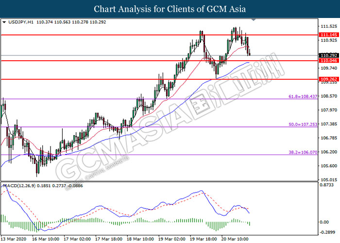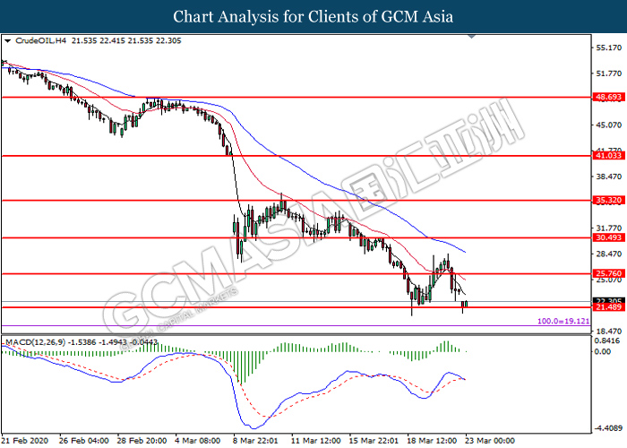 Di pasaran komoditi, harga minyak mentah menyusut sebanyak 9.18% ke $21.10 setong berikutan dengan beberapa badan ekonomi terbesar melaksanakan sekatan pergerakan di negara mereka untuk menyekat kesan negatif pandemik, meletakkan prospek permintaan minyak di ‘zon gelap’. Di samping itu, harga emas menurun sebanyak 0.33% ke 1,493.20 satu troy auns selepas pasaran niaga hadapan AS jatuh dengan ketara pada hari semalam, pelabur dihendaki melepaskan pegangan emas mereka untuk mengelakkan risiko margin call.