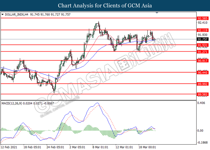 DOLLAR_INDX, H4: Indeks dolar telah didagang dengan lebih rendah selepas ia berundur dari tahap rintangan di 92.10. MACD yang memaparkan isyarat momentum bullish yang berkurangan mencadangkan indeks ini untuk melanjutkan kerugiannya dan menuju ke arah tahap sokongan di 91.55.