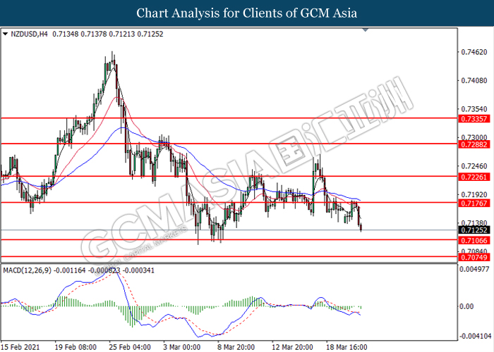 NZDUSD, H4: NZDUSD telah didagang dengan lebih rendah selepas ia berundur dari tahap rintangan di 0.7175. MACD yang menunjukkan isyarat momentum bearish yang berterusan mencadangkan pasangan ini untuk melanjutkan kerugiannya dan menuju ke arah tahap sokongan di 0.7105.
