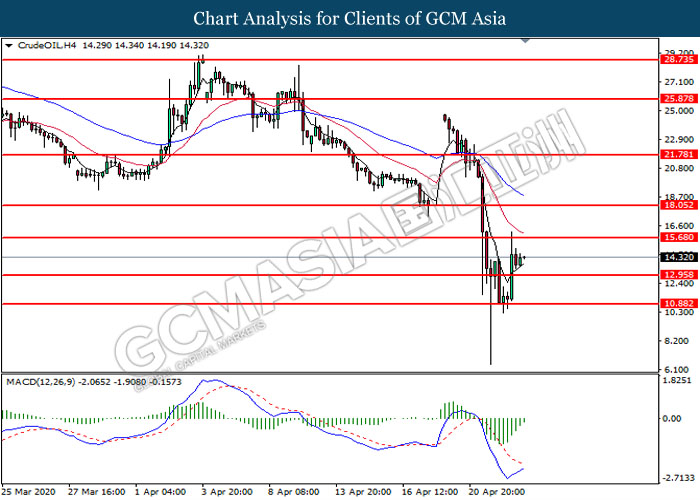 Di pasaran komoditi, harga minyak mentah menyusut sebanyak 0.10% ke $14.10 setong kerana inventori minyak mentah AS menunjukkan peningkatan yang tinggi pada minggu lalu. Menurut EIA, data US Crude Oil Inventories dibebaskan pada 15.022M, sedikit lebih rendah daripada ramalan ekonomi 15.150M, sambil menunjukkan bahawa masalah bekalan global yang melebihi masih belum dapat diselesaikan. Selain itu, harga emas jatuh 0.10% ke $1712.05 setroy auns susulan dengan peningkatan risiko pasaran terhadap aset yang lebih berisiko.