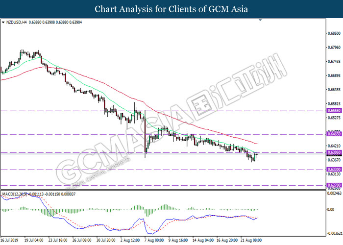 NZDUSD, H4: NZDUSD telah didagang dengan lebih tinggi sementara menguji pada tahap rintangan 0.6395. MACD yang menunjukkan penyusutan pada momentum bearish mencadangkan pasangan ini untuk melanjutkan keuntungannya selepas ia berjaya untuk memecahkan pada tahap rintangan tersebut.