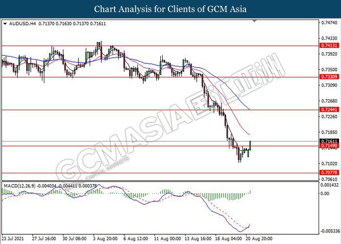 AUDUSD, H4: AUDUSD telah didagang dengan lebih tinggi susulan dengan pemecahan pada tahap rintangan sebelumnya 0.7150. MACD yang memaparkan isyarat momentum bullish mencadangkan pasangan ini untuk melanjutkan keuntungannya ke arah tahap rintangan 0.7245.