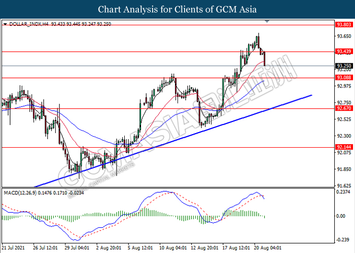 Indeks dolar yang didagang terhadap sebakul eman pasangan wang utama telah jatuh berikutan dengan pasaran berwaspada menjelang acara Jackson Hole Symposium pada minggu ini. Peningkatan dalam COVID-19 yang berterusan akan menyaksikan Fed A.S. untuk mengadakan simposium tahunan Jackson Hole dalam talian mulai 26 Ogos. Pengerusi Fed Jerome Powell mengekalkan nada yang dovish sehingga ke masa kini. Walau bagaimanapun, Presiden Dallas Fed Robert Kaplan memberikan petunjuk yang berpotensi sebelum simposium dimulakan dengan kenyataan bahawa pandangannya mengenai pengurangan aset tidak lama lagi akan disesuaikan sekiranya varian COVID-19 Delta terus menyebar dan mempengaruhi pemulihan ekonomi. Walaupun begitu, mata wang AS kekal disokong secara keseluruhan oleh kebimbangan bahawa varian Delta koronavirus dapat menjejaskan pemulihan ekonomi global. Oleh itu, pasaran sekarang akan fokus kepada Jackson Hole Symposium untuk mendapatkan petunjuk yang lebih lanjut. Pada masa penulisan, indeks dolar jatuh 0.18% kepada $ 93.33.