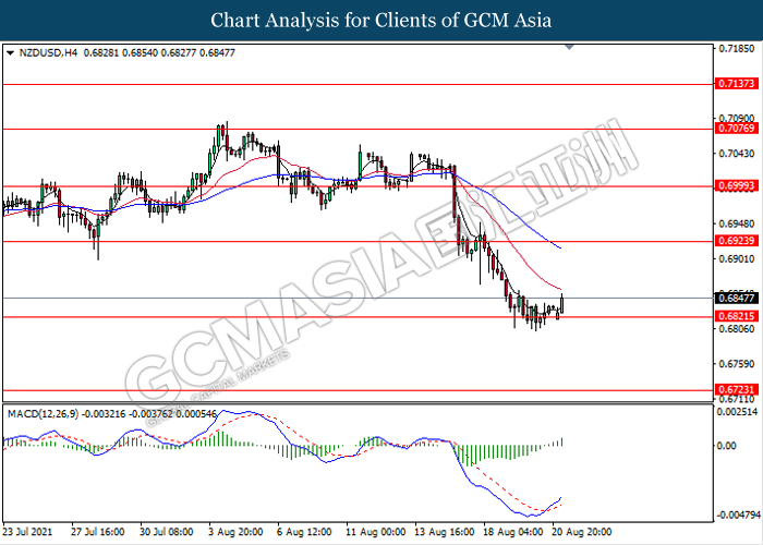 NZDUSD, H4: NZDUSD telah didagang dengan lebih tinggi susulan dengan lantunan dari tahap sokongan 0.6820. MACD yang memaparkan isyarat bias bullish dengan formasi silang emas mencadangkan pasangan ini untuk melanjutkan lantunannya ke arah tahap rintangan 0.6925.