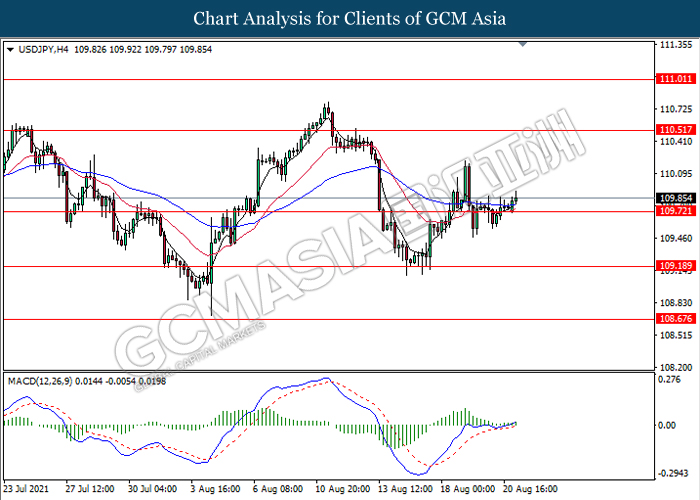 USDJPY, H4: USDJPY telah didagang dengan lebih tinggi susulan dengan lantunan dari tahap sokongan 109.70. MACD yang memaparkan isyarat momentum bullish mencadangkan pasangan ini untuk melanjutkan keuntungannya ke arah tahap rintangan 110.50.