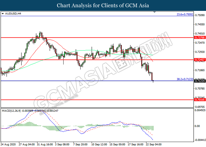 AUDUSD, H4: AUDUSD telah didagang dengan lebih rendah sementara kini menguji di tahap sokongan 0.7125. MACD yang memaparkan momentum bearish mencadangkan pasangan ini untuk melanjutkan kerugiannya selepas ia memecah tahap sokongan tersebut.