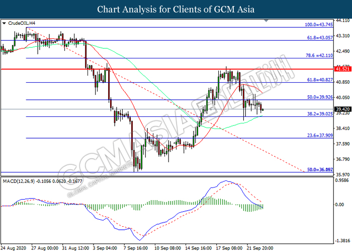 Di pasaran komoditi, harga minyak mentah menyusut 0.88% ke $39,45 setong di tengah peningkatan kebimbangan pasaran terhadap prospek permintaan minyak. Menurut statistik terbaru, kebangkitan Covid-19 telah dikesan di kebanyakan negara seperti Perancis dan UK, yang akhirnya menyebabkan prospek pasaran minyak menjadi kabur. Selain itu, harga emas merosot 0.50% ke $1890,10 satu troy ouns kerana selera pelabur terhadap aset selamat menurun.
