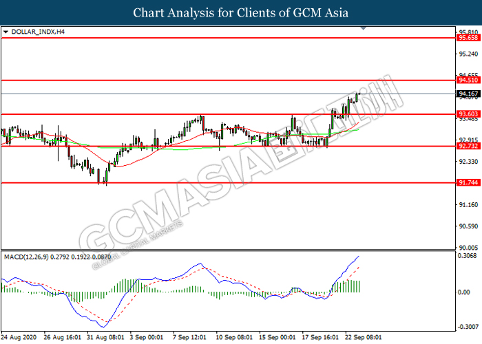 DOLLAR_INDX, H4: Indeks dolar telah didagang dengan lebih tinggi selepas ia memecah tahap rintangan terdahulu 93.60. MACD yang memaparkan momentum bullish mencadangkan pasangan ini untuk melanjutkan keuntungannya ke arah tahap rintangan 94.50.