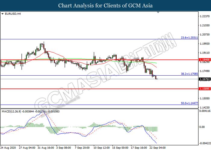 EURUSD, H4: EURUSD telah didagang dengan lebih rendah selepas ia memecah tahap sokongan terdahulu 1.1710. MACD yang memaparkan momentum bearish mencadangkan pasangan ini untuk melanjutkan kerugiannya ke arah tahap sokongan 1.1590.