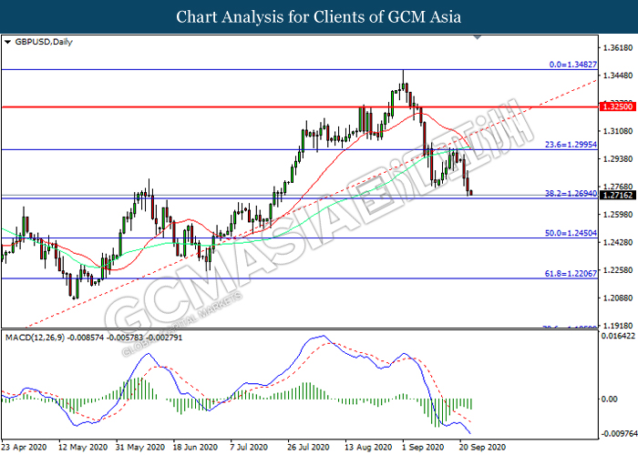 Paun Sterling yang bertindak sebagai salah satu mata wang utama di pasaran FX menjunam dengan ketara selepas Perdana Menteri UK mengumumkan untuk melancarkan langkah sekatan Covid baru untuk mengehadkan penyebaran virus. Menurut Worldometers, UK telah mencatatkan sejumlah kes yang disahkan berhampiran 5K sambil menunjukkan kadar peningkatan jangkitan yang jelas. Dalam langkah baru tersebut, ia termasuk memperluaskan penggunaan penutup muka, mengehadkan waktu pembukaan bar, pub dan restoran dan juga meningkatkan denda terhadap pelanggar peraturan. Selain itu, Boris Johnson juga memperingatkan masyarakat untuk mematuhi sekatan Covid yang baru, jika tidak, sekatan penguncian akan dikenakan kembali untuk mengehadkan penyebaran virus. Di sisi lain, kebuntuan Brexit yang tidak dapat diselesaikan masih menghantui sentimen pasaran paun. Setakat ini, kedua-dua pihak masih berunding sementara dengan harapan dapat memecahkan kebuntuan sebelum tarikh akhir iaitu pertengahan bulan Oktober. Semasa penulisan, pasangan mata wang GBP/USD jatuh 0.09% ke 1.2720.