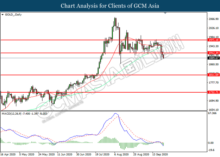 GOLD_, Daily: Harga emas telah didagang dengan lebih rendah selepas ia memecah tahap sokongan terdahulu 1912.35. MACD yang memaparkan momentum bearish mencadangkan komoditi ini untuk melanjutkan kerugiannya ke arah tahap sokongan 1811.70.