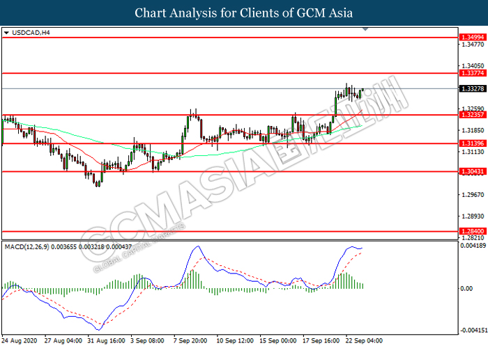 USDCAD, H4: USDCAD telah didagang dengan lebih tinggi selepas ia memecah tahap irntangan terdahulu 1.3235. Namun, MACD yang memaparkan momentum bullish yang berkurangan mencadangkan pasangan ini untuk mengalami pembetulan teknikal bagi jangka pendek.