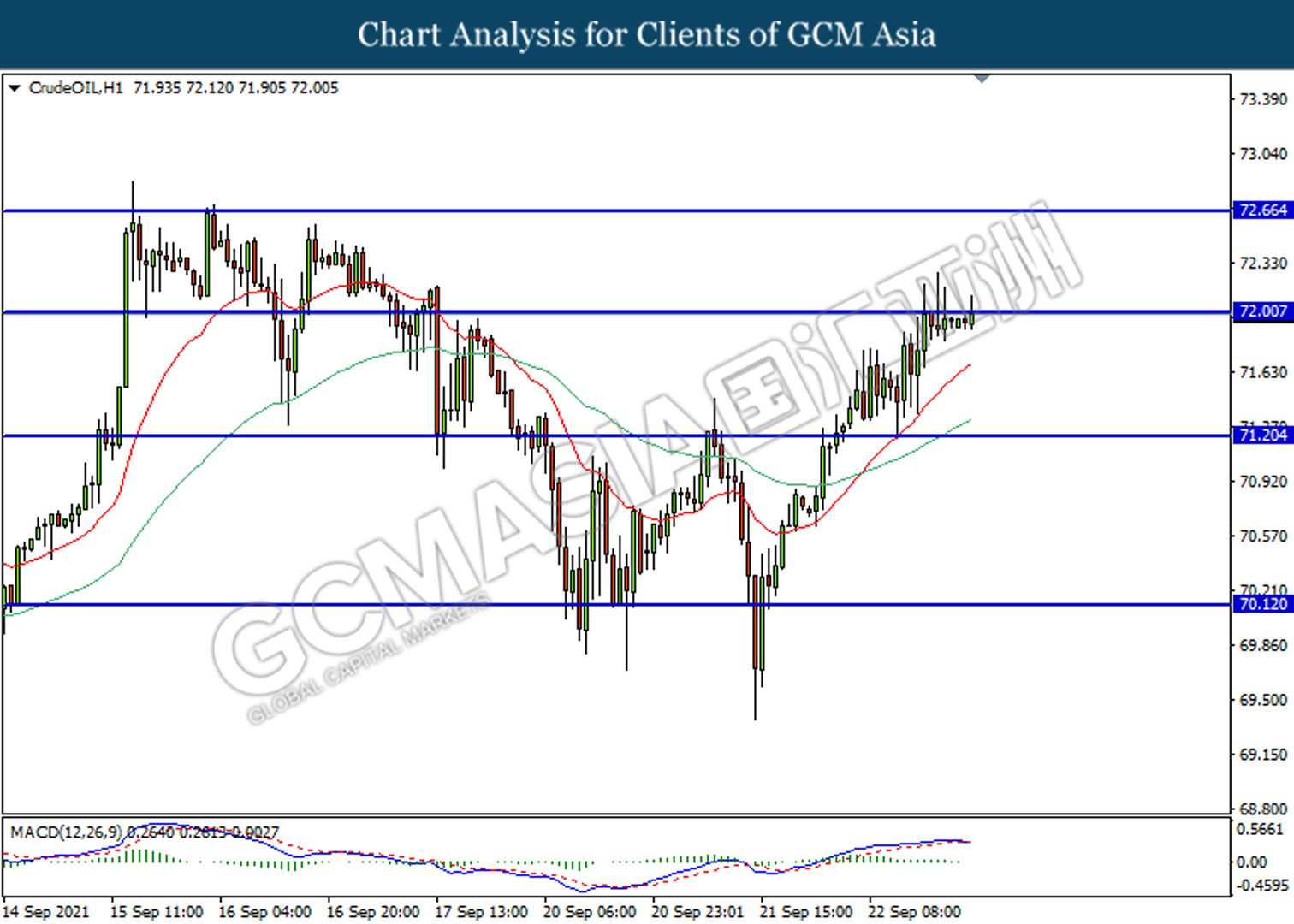 CrudeOIL, H1: Harga minyak mentah telah didagang dengan lebih tinggi sementara kini menguji di 72.00. Namun, MACD yang memaparkan penyusutan pada momentum menaik mencadangkan harganya untuk didagang dengan lebih rendah bagi jangka pendek sebagai pembetulan teknikal.