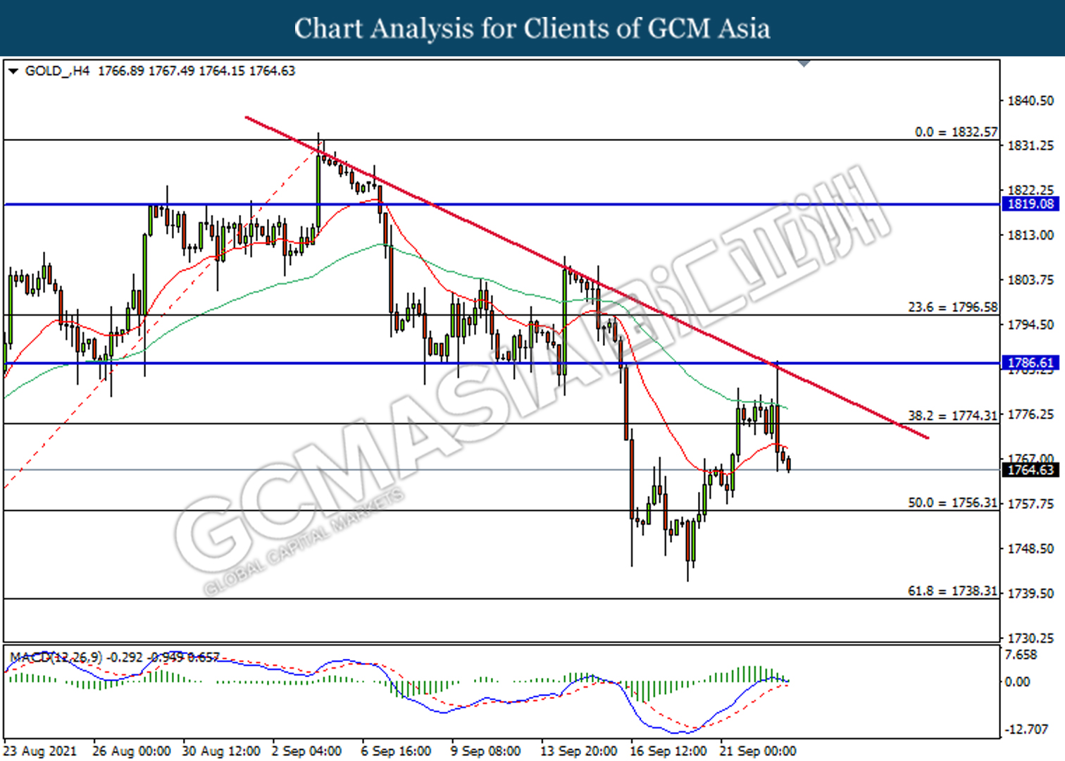 GOLD_, H4: Harga emas telah didagang dengan lebih rendah selepas ia berundur dari garisan trend menurun. MACD yang memaparkan isyarat bearish mencadangkan harganya untuk didagang dengan lebih rendah dan menuju ke arah 1756.30.