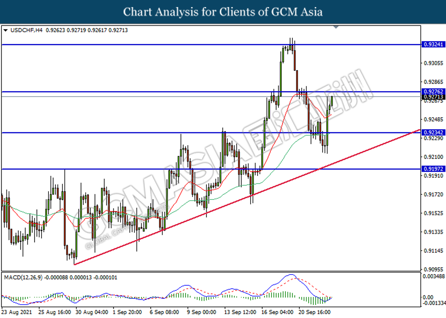USDCHF, H4: USDCHF telah didagang dengan lebih tinggi selepas ia melantun dari paras rendahnya. MACD yang mula untuk membentuk isyarat bullish mencadangkan pasangan ini untuk meneruskan kenaikannya selepas pemecahan di 0.9275.