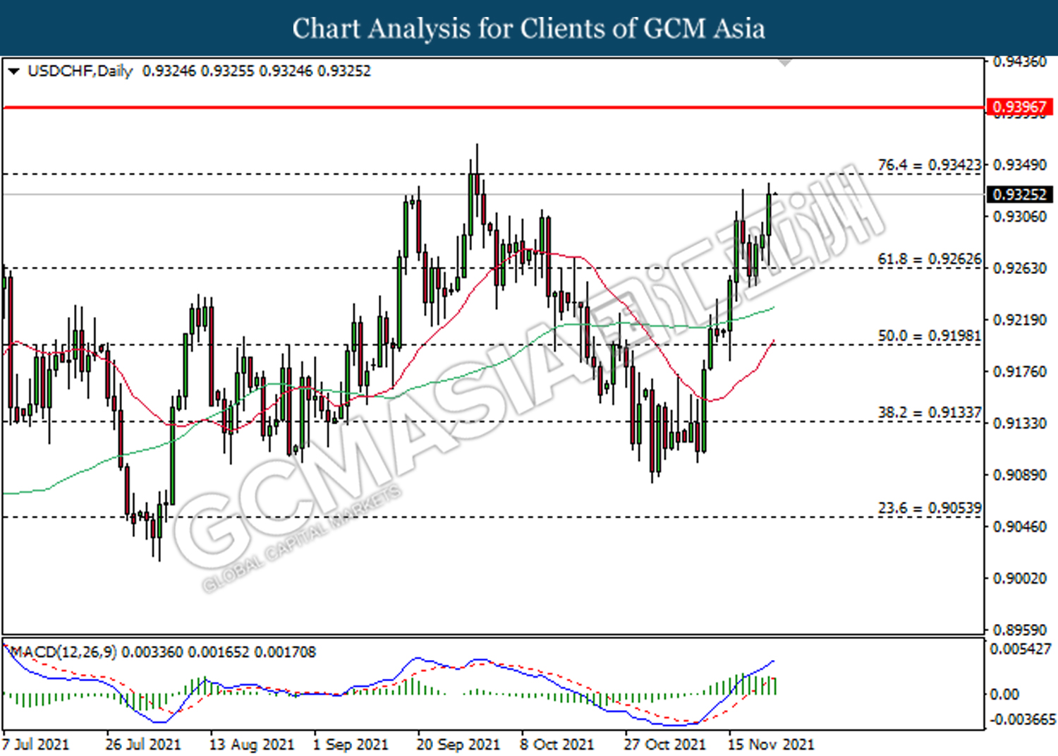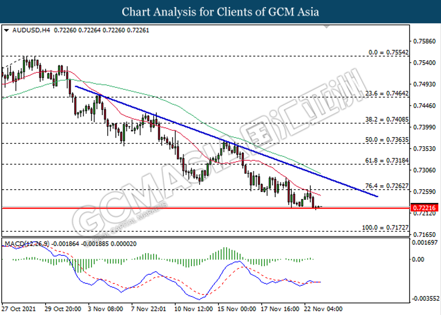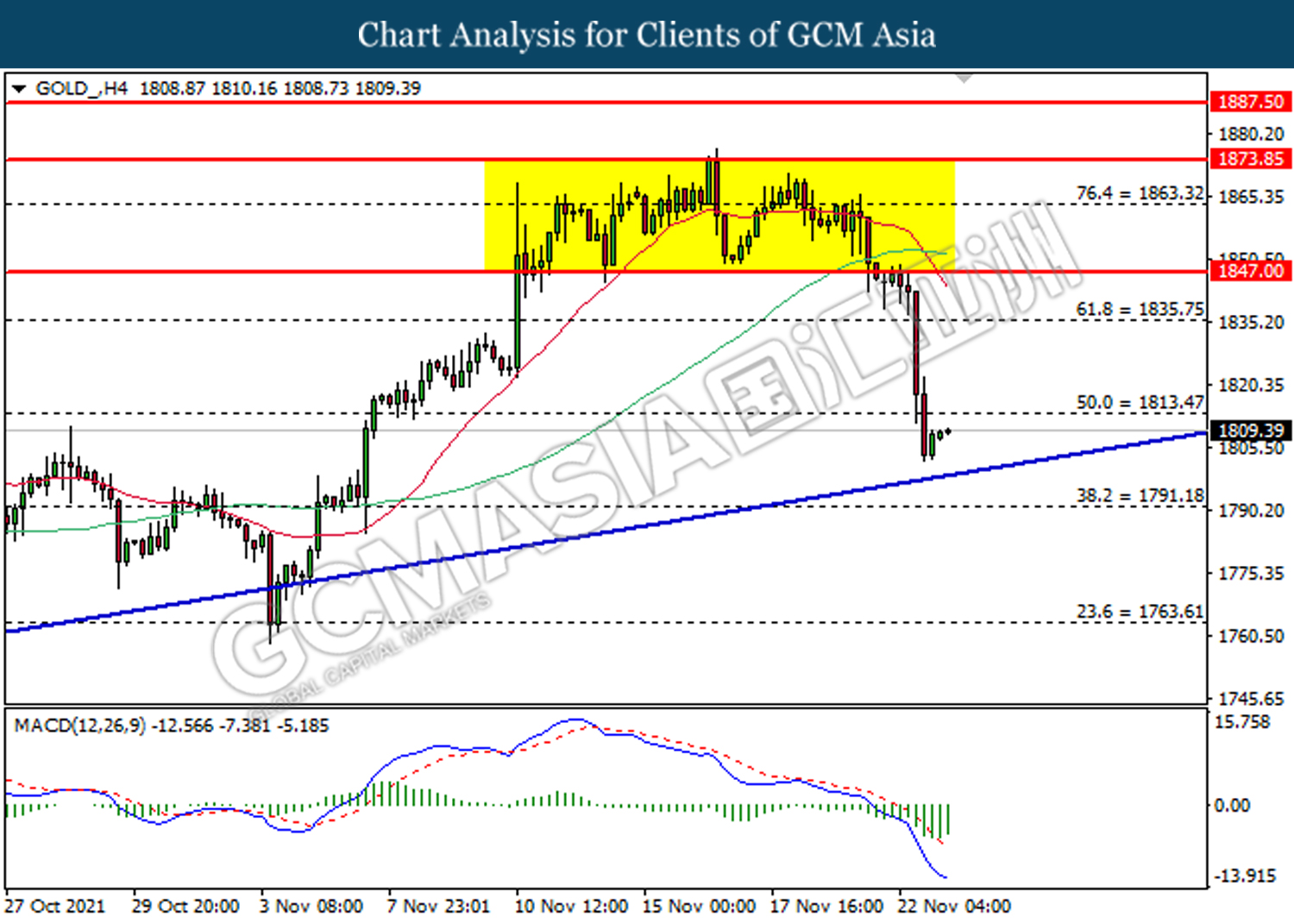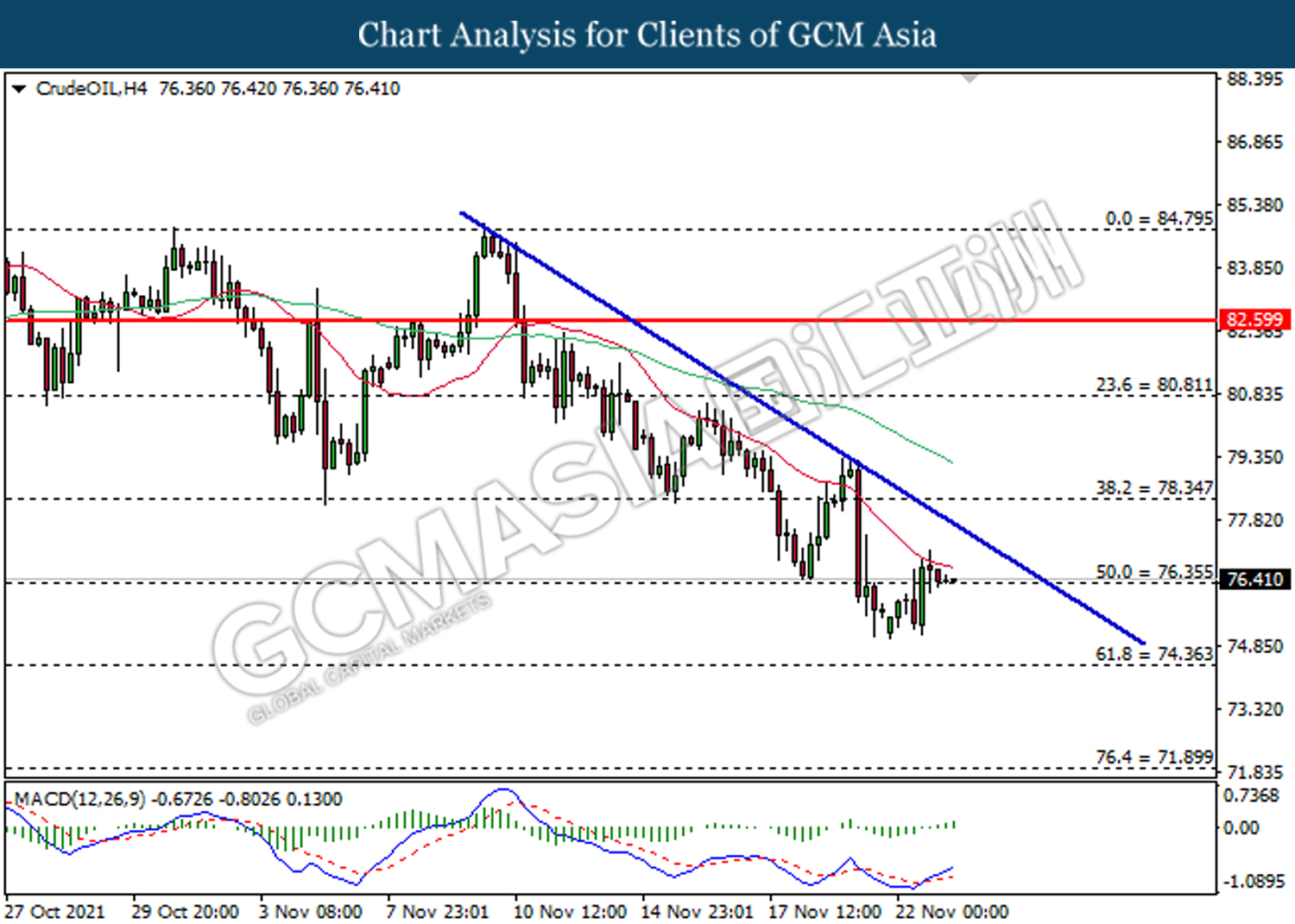 Dalam pasaran komoditi, harga minyak mentah menurun sebanyak 0.11% kepada $76.35 setong semasa penulisan. Pasaran minyak melanjutkan kerugiannya selepas Perdana Menteri Jepun Fumio Kishida bersedia untuk melepaskan rizab minyaknya pada hujung minggu manakala kerajaan India dikhabarkan tengah berbincang dengan AS mengenai penggunaan minyak daripada rizab strategik. Sebaliknya, harga emas menurun sebanyak 0.25% kepada $1809.30 se troy auns kerana pembetulan teknikal.