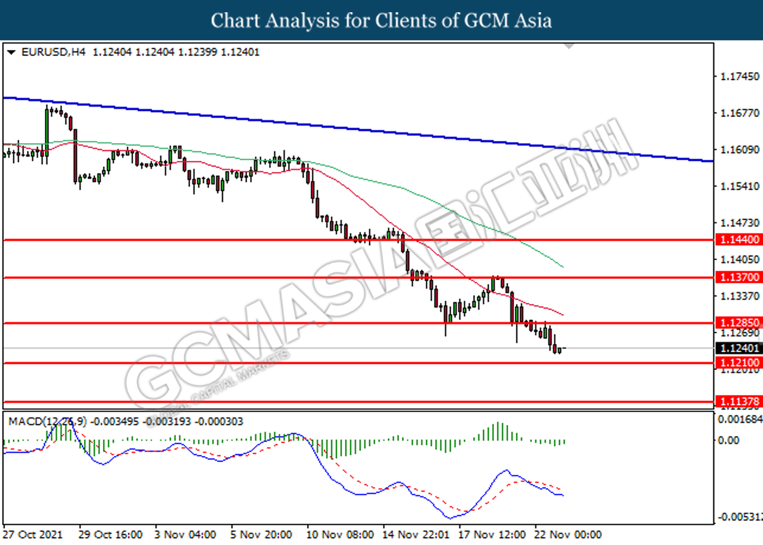 EURUSD, H4: EURUSD telah didagang dengan lebih rendah selepas ia memecahkan 1.1285. MACD yang memaparkan isyarat bearish mencadangkan pasangan ini untuk didagang dengan lebih rendah bagi jangka pendek.