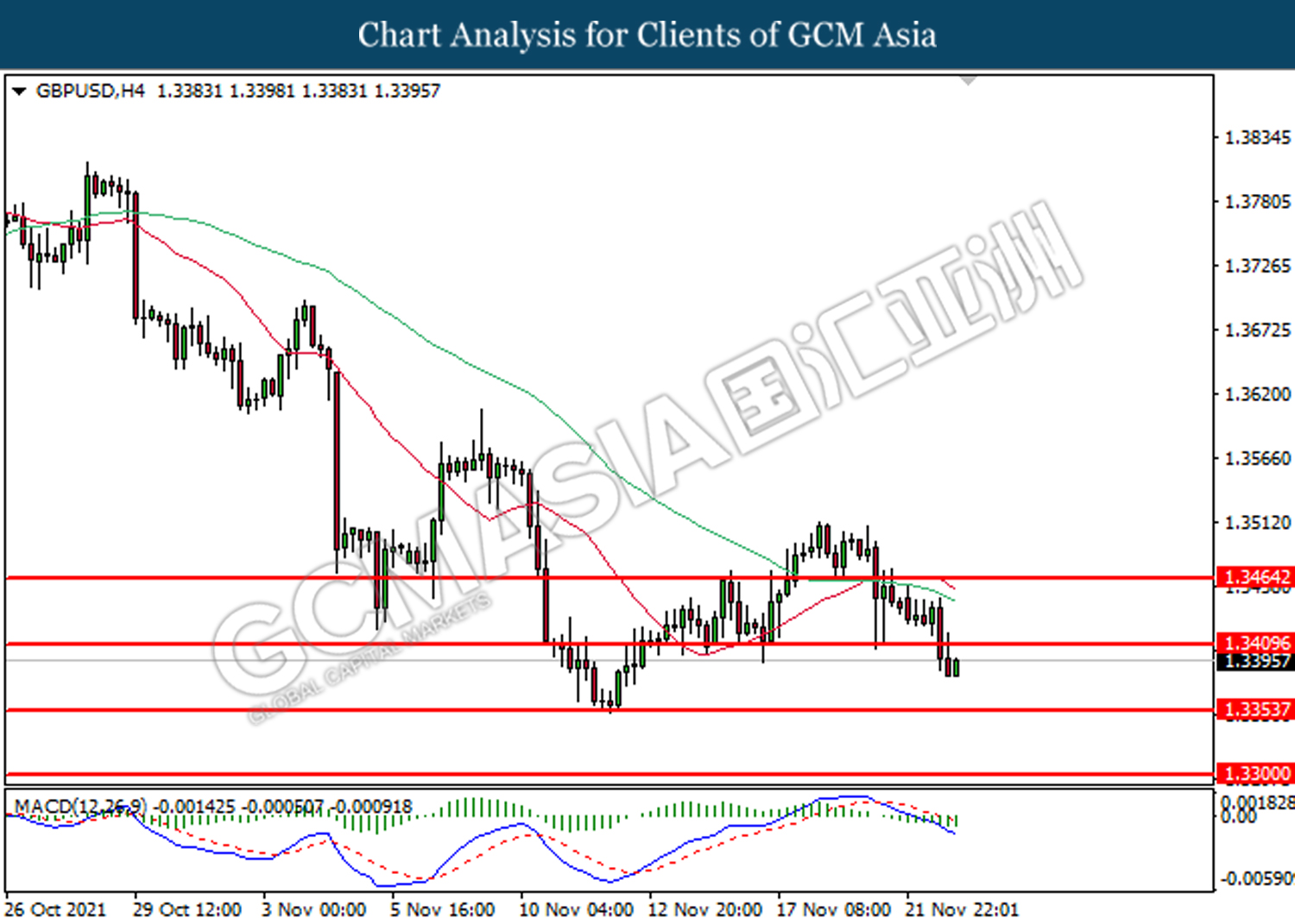 GBPUSD, H4: GBPUSD telah didagang dengan lebih rendah selepas ia memecahkan 1.3410. MACD yang memaparkan isyarat bearish mencadangkan pasangan ini untuk meneruskan penurunnya bagi jangka pendek.