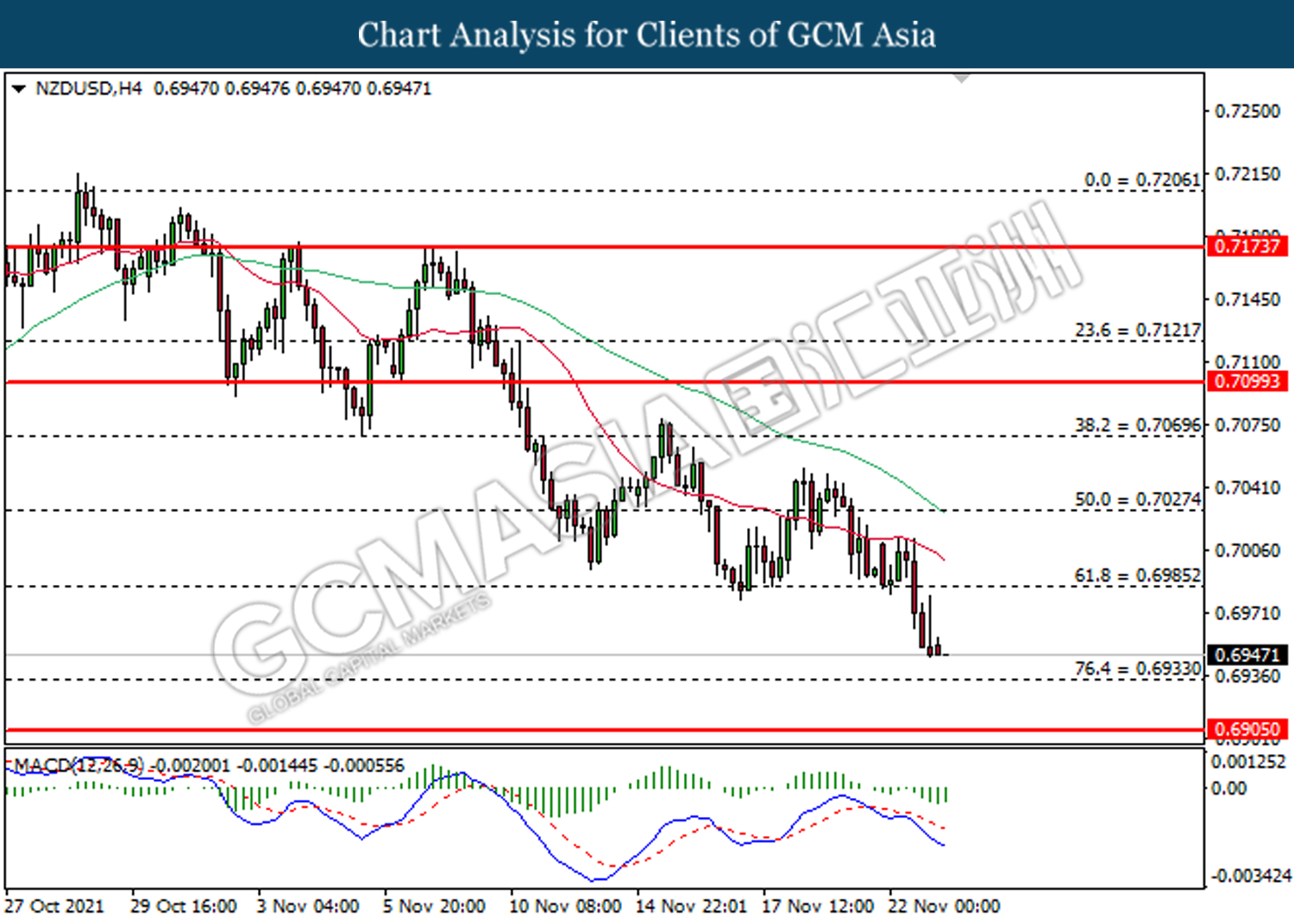 NZDUSD, H4: NZDUSD telah didagang dengan lebih rendah selepas ia memecahkan 0.6985. MACD yang memaparkan isyarat bearish mencadangkan pasangan ini untuk didagang dengan lebih rendah bagi jangka pendek.