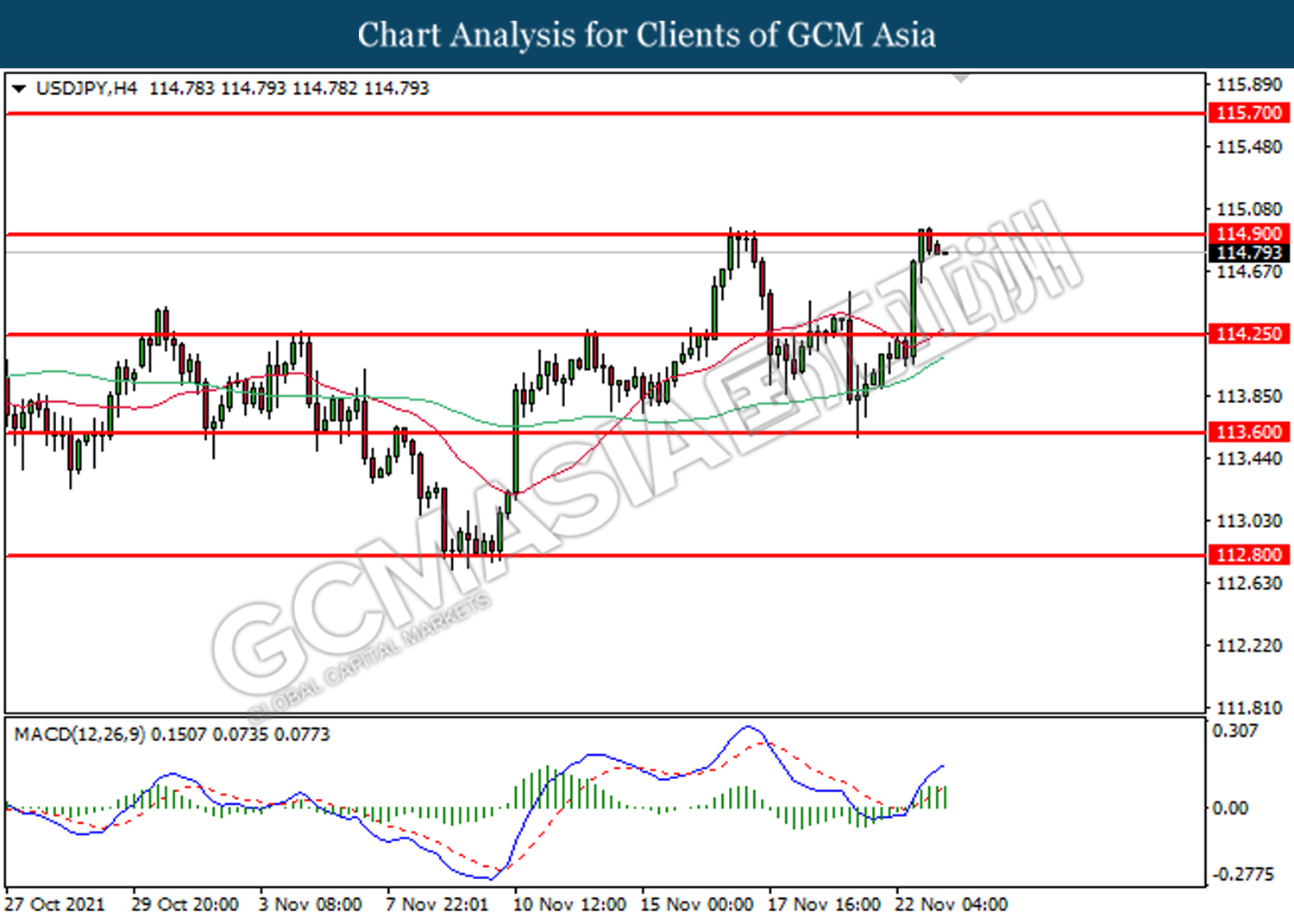 USDJPY, H4: USDJPY telah didagang dengan lebih tinggi selepas ia melantun dari paras bawah. Namun, MACD yang memaparkan penyusutan pada momentum menaik mencadangkan pasangan ini untuk didagang dengan lebih rendah bagi jangka pendek sebagai pembetulan teknikal.