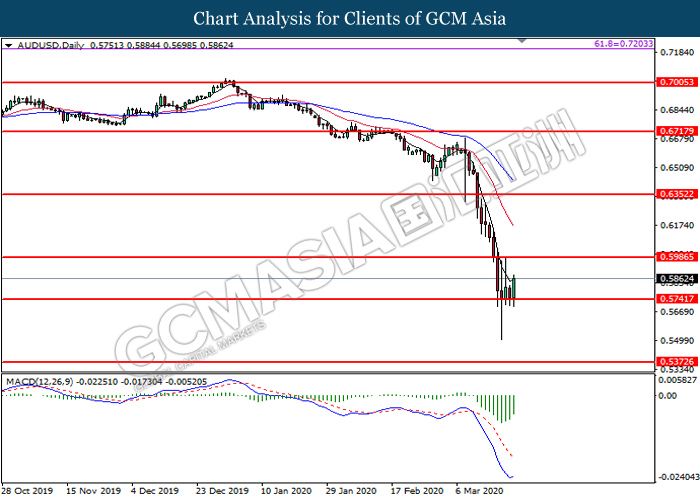 AUDUSD, Daily: AUDUSD telah didagang dengan lebih tinggi selepas ia melantun dari tahap sokongan di 0.5740. MACD yang memaparkan isyarat momentum bearish yang berkurangan mencadangkan pasangan ini untuk melanjutkan keuntungannya dan menuju ke arah tahap rintangan di 0.5985.