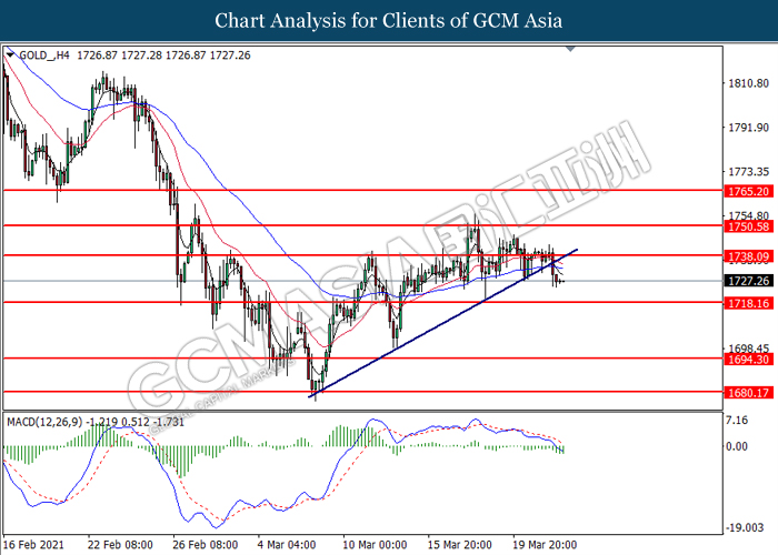 GOLD_, H4: Harga emas telah didagang dengan lebih rendah selepas ia memecah garisan aliran menaik. MACD yang memaparkan momentum bearish yang berterusan mencadangkan komoditi ini untuk melanjutkan kerugiannya dan menuju ke arah tahap sokongan di 1718.15.