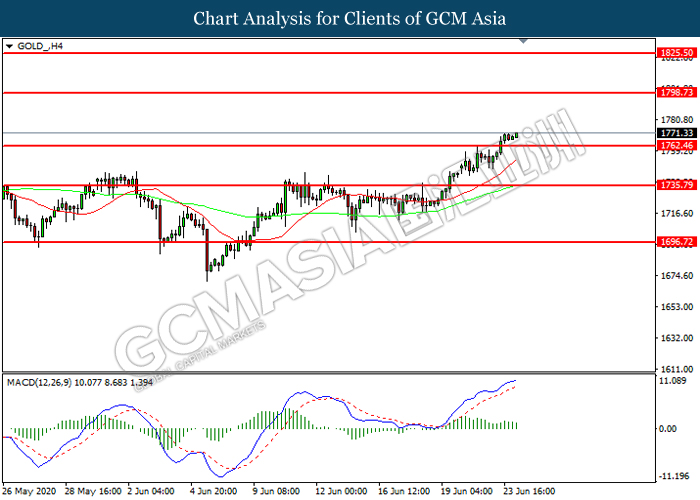 GOLD_, H4: Harga emas telah didagang dengan lebih tinggi selepas ia memecah tahap rintangan terdahulu 1762.45. Namun, MACD yang memaparkan momentum bullish yang berkurangan mencadangkan komoditi ini untuk mengalami pembetulan teknikal bagi jangka pendek.