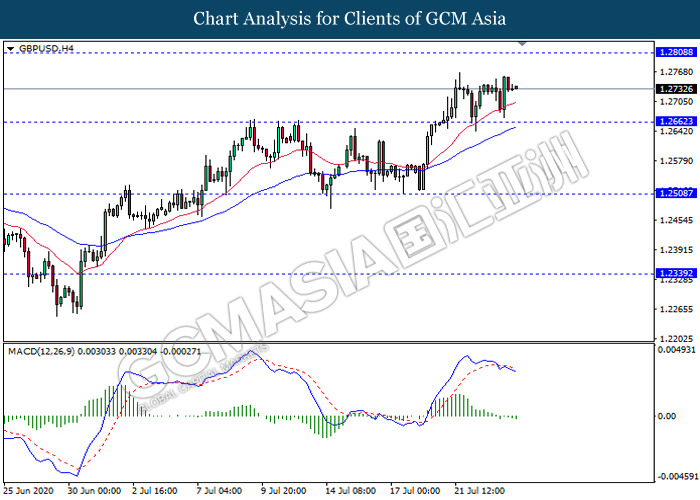 GBPUSD, H4: GBPUSD telah didagang dengan rata susulan dengan lantunan dari paras rendahnya baru-baru ini. MACD yang memaparkan isyarat bias bearish dengan formasi silang kematian mencadangkan pasangan ini untuk didagang dengan lebih rendah dalam jangka pendek ke arah tahap sokongan 1.2660.