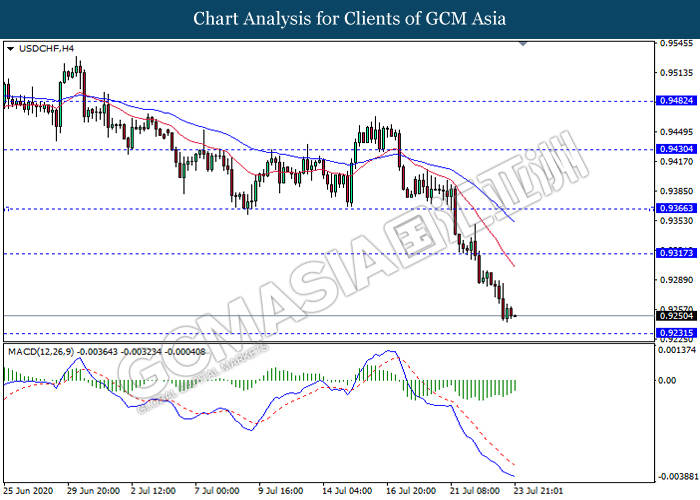 USDCHF, H4: USDCHF telah didagang dengan lebih rendah sementara ia sedang menguji berhampiran dengan tahap sokongan 0.9230. Namun, MACD yang memaparkan isyarat momentum bearish yang berkurangan mencadangkan pasangan ini untuk mengalami pembetulan teknikal jangka pendek ke arah tahap rintangan 0.9315.
