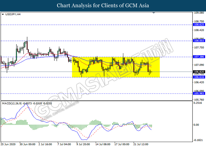 USDJPY, H4: USDJPY kekal didagang dalam saluran sisi sementara ia sedang menguji berhampiran dengan tahap sokongan 106.60. Namun, MACD yang memaparkan isyarat momentum bearish mencadangkan pasangan ini untuk didagang dengan lebih rendah selepas ia memecah tahap sokongan tersebut.