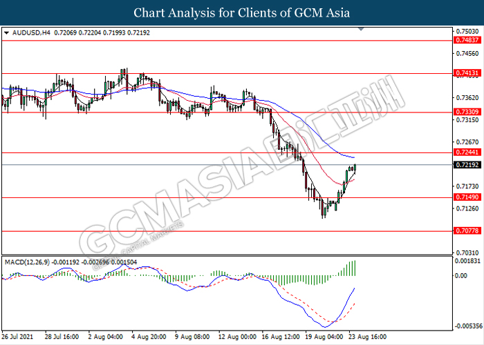AUDUSD, H4: AUDUSD telah didagang dengan lebih tinggi sementara ia sedang menguji berhampiran dengan tahap rintangan 0.7245. MACD yang memaparkan isyarat momentum bullish mencadangkan pasangan ini untuk melanjutkan keuntungannya selepas ia memecah tahap rintangan tersebut.