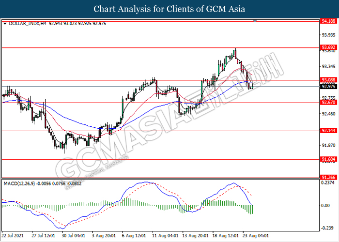 DOLLAR_INDX, H4: Indeks dolar telah didagang dengan lebih rendah susulan dengan pemecahan pada tahap sokongan sebelumnya 93.10. MACD yang memaparkan isyarat momentum bearish yang berterusan mencadangkan dolar untuk melanjutkan kerugiannya ke arah tahap sokongan 92.65.