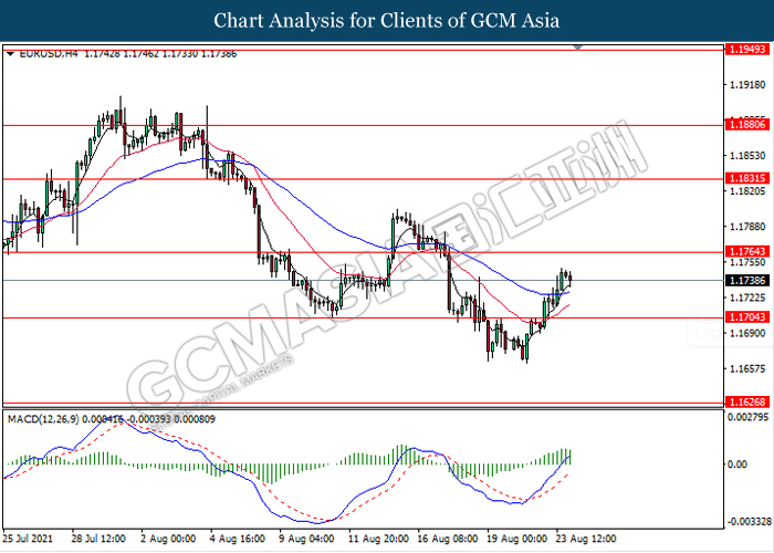 EURUSD, H4: EURUSD telah didagang dengan lebih tinggi semenara ia sedang menguji berhampiran dengan tahap rintangan 1.1765. Namun, MACD yang memaparkan isyarat momentum bullish yang berkurangan mencadangkan pasangan ini untuk didagang dengan lebih rendah dalam jangka pendek ke arah tahap sokongan 1.1705.