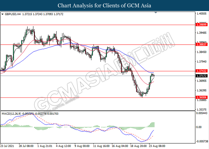 GBPUSD, H4: GBPUSD telah didagang dengan lebih tinggi semenara ia sedang menguji berhampiran dengan tahap rintangan 1.3745. MACD yang memaparkan isyarat momentum bullish yang berkurangan mencadangkan pasangan ini untuk melanjutkan pengundurannya ke arah tahap rintangan 1.3745.