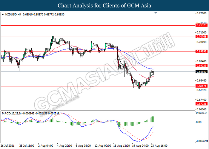 NZDUSD, H4: NZDUSD telah didagang dengan lebih tinggi sementara ia sedang menguji berhampiran dengan tahap rintangan 0.6925. MACD yang memaparkan isyarat momentum bullish yang berterusan mencadangkan pasangan ini untuk melanjutkan keuntungannya selepas ia memecah tahap rintangan tersebut.