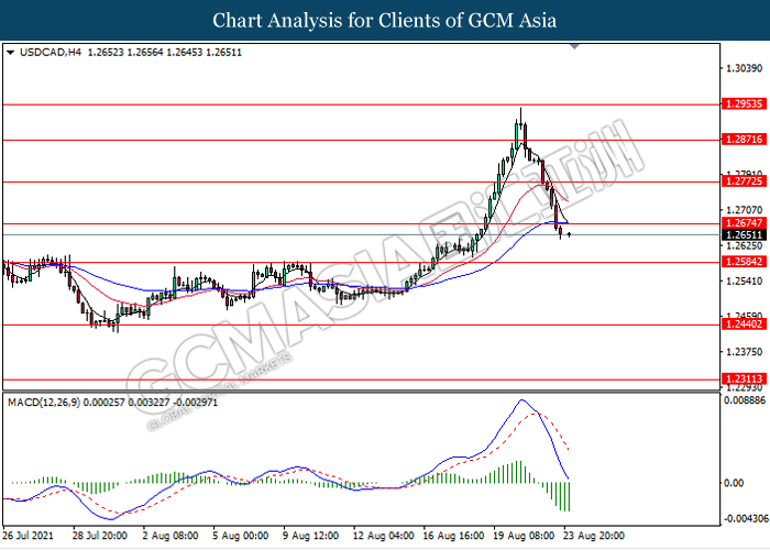 USDCAD, H4: USDCAD telah didagang dengan lebih rendah susulan dengan pemecahan pada tahap sokongan sebelumnya 1.2675. MACD yang memaparkan isyarat momentum bearish yang berterusan mencadangkan pasangan ini untuk melanjutkan kerugiannya ke arah tahap sokongan 1.2585.