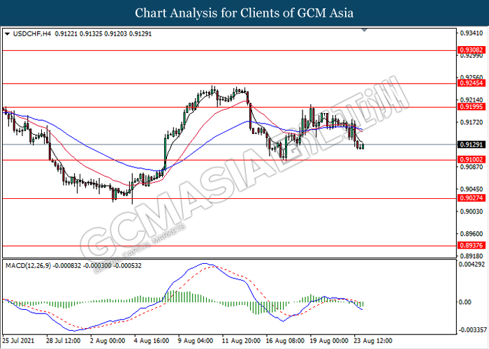 USDCHF, H4: USDCHF telah didagang dengan lebih rendah sementara ia sedang menguji berhampiran dengan tahap sokongan 0.9100. MACD yang memaparkan isyarat momentum bearish mencadangkan pasangan ini untuk melanjutkan kerugiannya selepas ia memecah tahap sokongan tersebut.