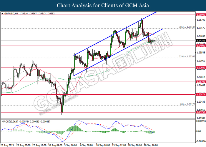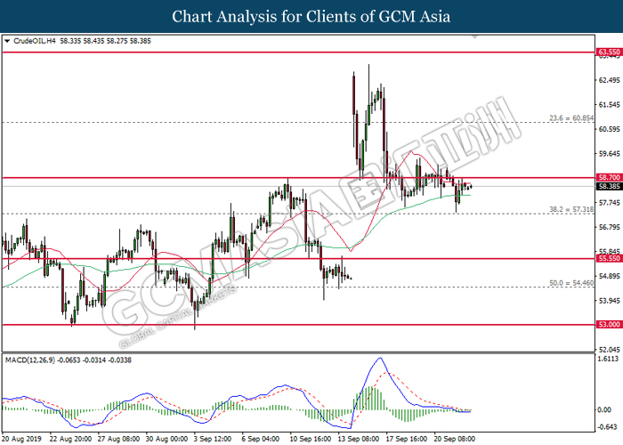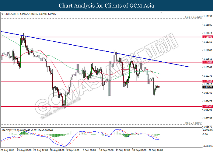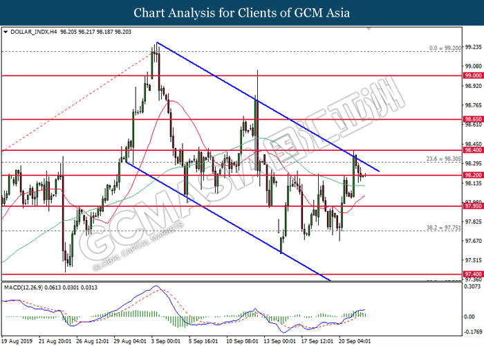 Dolar AS telah meneruskan kenaikannya pada semalam berikutan dengan data serantau yang positif serta penjualan yang ketara pada mata wang utama yang lain. Semasa penulisan, indeks dolar meningkat sebanyak 0.10% ke 98.20 semasa sesi Asia. Menurut kepada Markit, US Manufacturing PMI telah meningkat ke paras 51.0 bagi bulan September, lebih baik daripada ramalan ekonomis untuk kekal sama di 50.3. Secara lazimnya, data ini memaparkan bahawa sektor pembuatan di AS adalah masih kukuh walaupun terdapatnya risiko perang perdagangan diantara AS dan China. Namun, kenaikan pada dolar AS adalah terhad selepas Services PMI bagi bulan September meningkat ke 50.9, lebih rendah daripada ramalan ekonomis iaitu 51.3. Sentimen pasaran terhadap dolar adalah masih positif sementara para pelabur memberi tumpuan kepada data ekonomi yang lebih lanjut bagi melihat arah tuju dasar kewangan Bank Pusat AS. Sebaliknya, pasangan EUR/USD susut sebanyak 0.01% ke 1.0990. Euro menerima tekanan menurun pada semalam selepas German Manufacturing PMI susut ke paras 41.4, tersasar daripada ramalan ekonomis iaitu 44.0 bagi bulan September. Data ini telah mengukuhkan pandangan pasaran bahawa ekonomi EU adalah masih rapuh dan ia bakal mendorong kepada kelonggaran dasar yang lebih lanjut pada masa hadapan sekiranya keadaan semasa makin bertambah buruk.