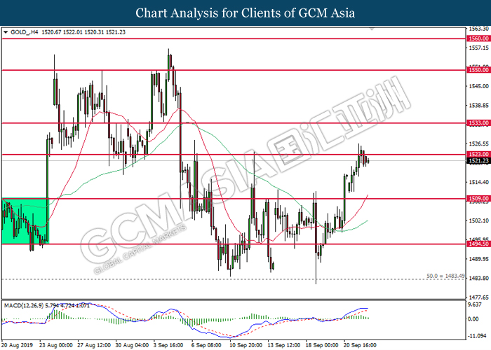 GOLD_, H4: Harga emas telah didagang dengan lebih rendah selepas ia berundur dari tahap rintangan 1523.00. MACD yang memaparkan penyusutan pada momentum menaik mencadangkan harganya untuk didagang dengan lebih rendah bagi jangka pendek sebagai pembetulan teknikal.