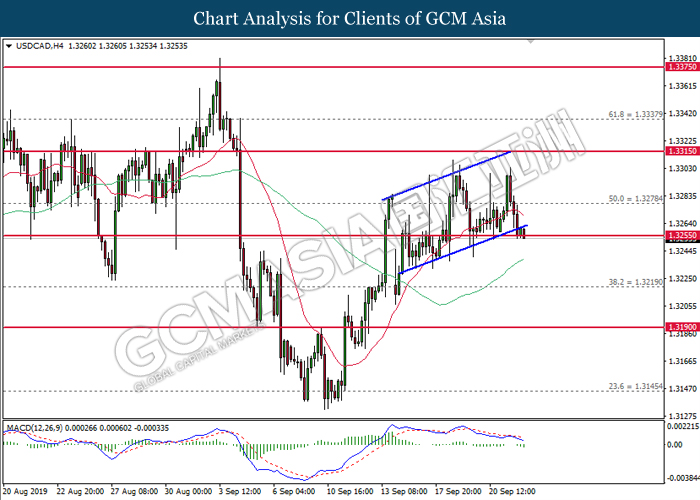 USDCAD, H4: USDCAD telah didagang dengan lebih rendah sementara kini menguji di tahap sokongan 1.3255. MACD yang memaparkan isyarat bearish mencadangkan pasangan ini untuk meneruskan kerugiannya selepas pemecahan berlaku di 1.3255.