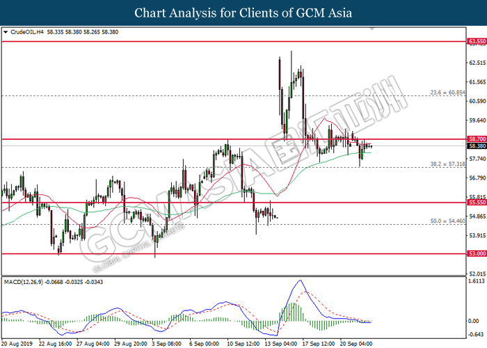 CrudeOIL, H4: Harga minyak mentah telah didagang dengan lebih tinggi selepas ia melantun dari paras rendahnya. MACD yang memaparkan penyusutan pada momentum menurun mencadangkan harganya untuk didagang dengan lebih tinggi selepas pemecahannya di 58.70.