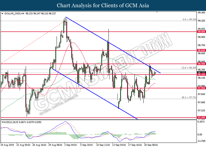 DOLLAR_INDX, H4: Indeks dolar telah didagang dengan lebih tinggi selepas ia melantun dari paras rendahnya. MACD yang memaparkan isyarat bullish mencadangkan indeks ini untuk meningkat selepas pemecahan berlaku di 98.20.